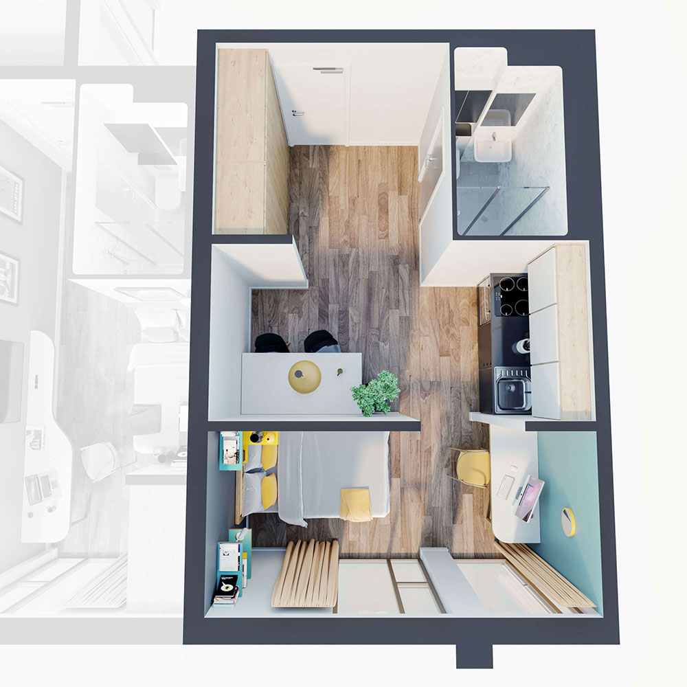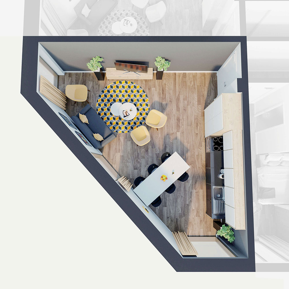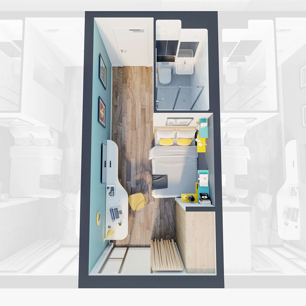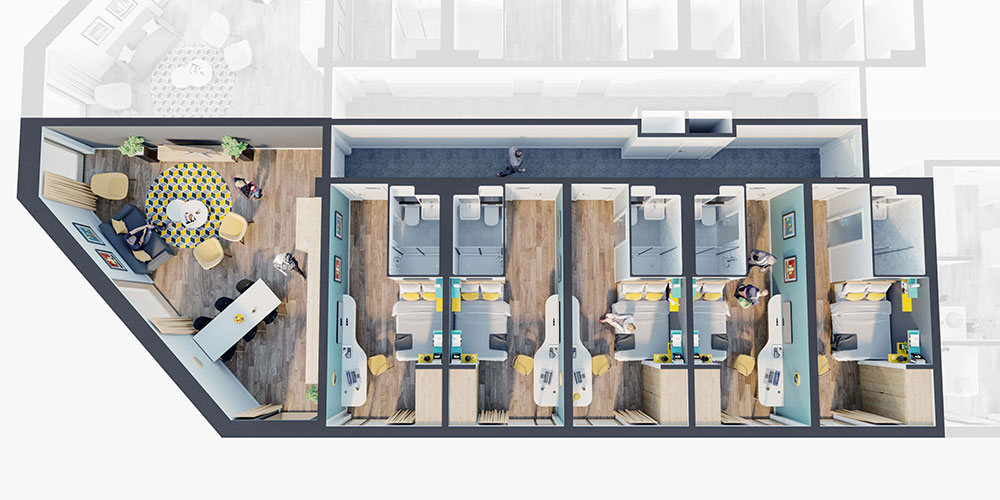 They currently have a special offer for multiple purchases which is; purchase a cluster of en-suite rooms (each cluster is 5 or 6 bedrooms, see typical layout below) and receive the communal area free of charge.